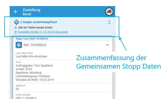 💡 Angezeigt wird auch eine Zusammenfassung aller gemeinsamer Stopp-Daten der Zusammenfassung. Das ist im Normalfall die Adresse und der (Kunden-) Name. So sind alle relevanten Stopp-Infos immer ganz oben auf einen Blick ersichtlich.